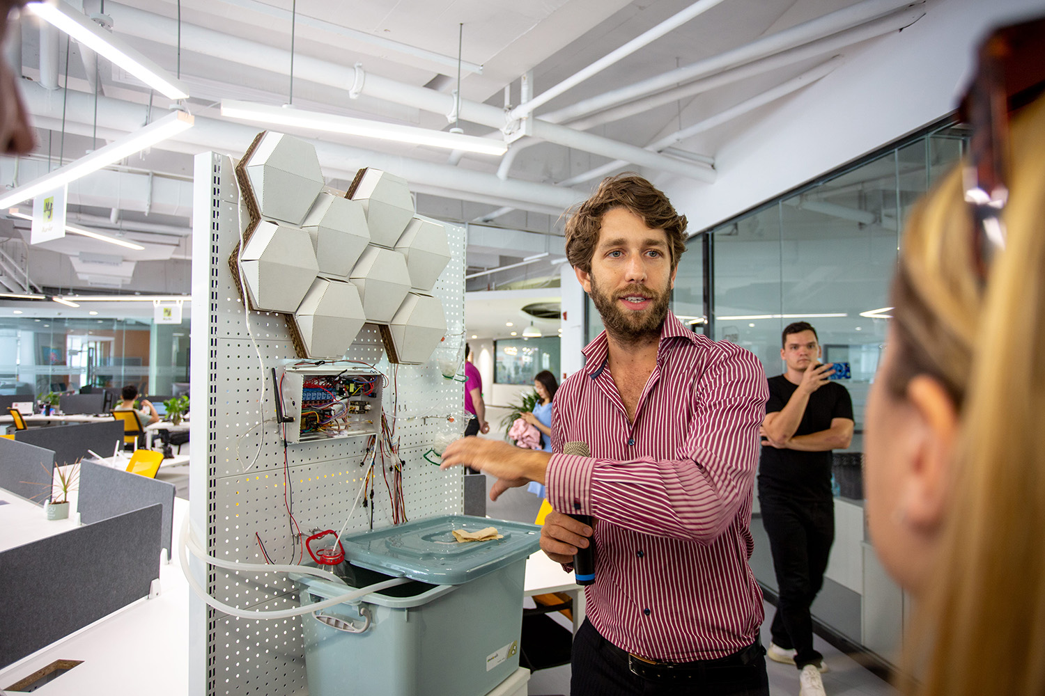 BU: Quinten van Duin, „Maker“ und Entrepreneur aus den Niederlanden, stellt in Haikou seine intelligente Ökowand vor (Foto: Dan Sandoval)