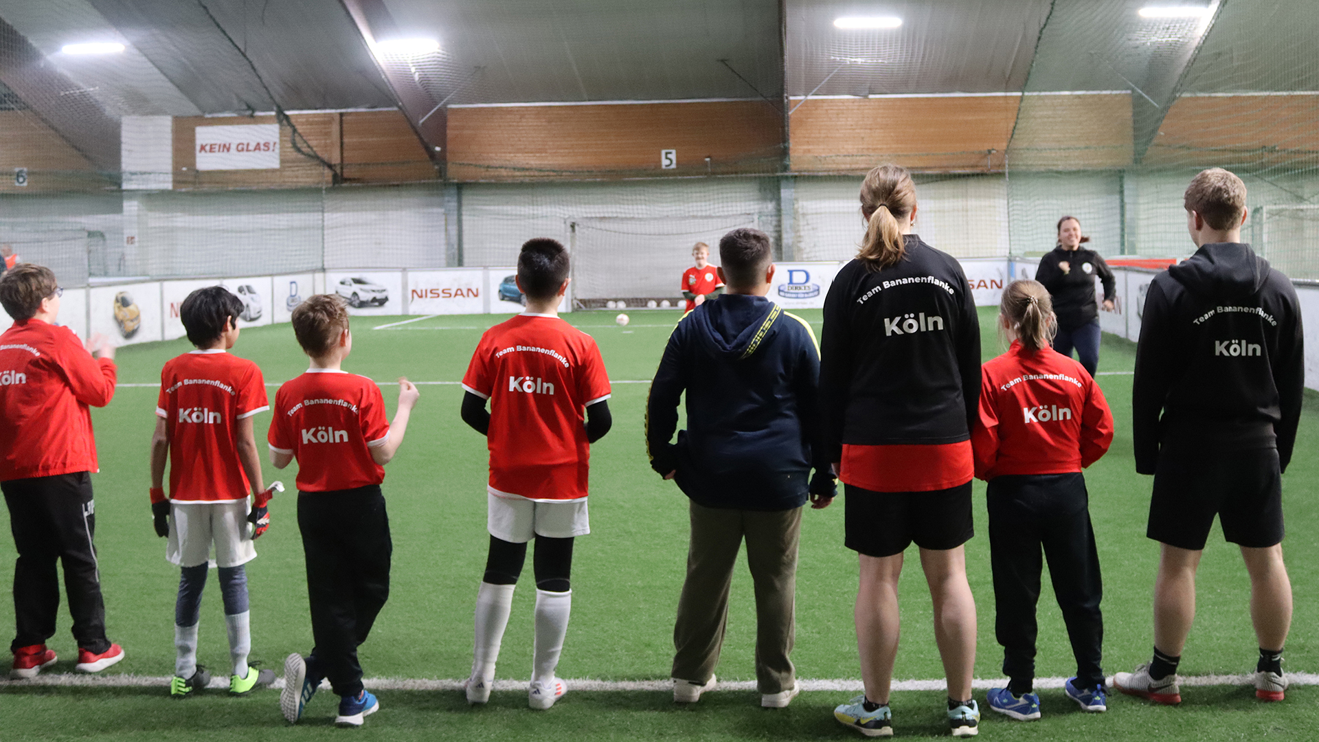 Bu: Die Kindergruppe im Verein Team Bananenflanke Köln e.V. trainiert in den Wintermonaten in der SoccerWorld in Köln-Lövenich (Foto: ownSoft GmbH)